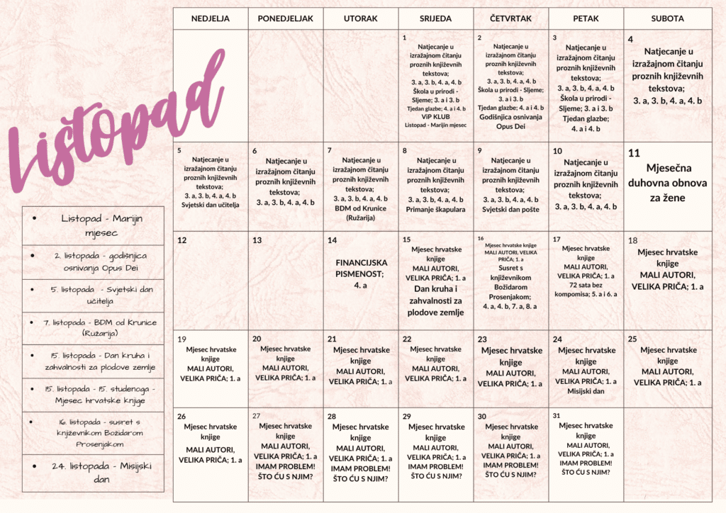 KALENDAR DOGAĐANJA ZA MJESEC LISTOPAD